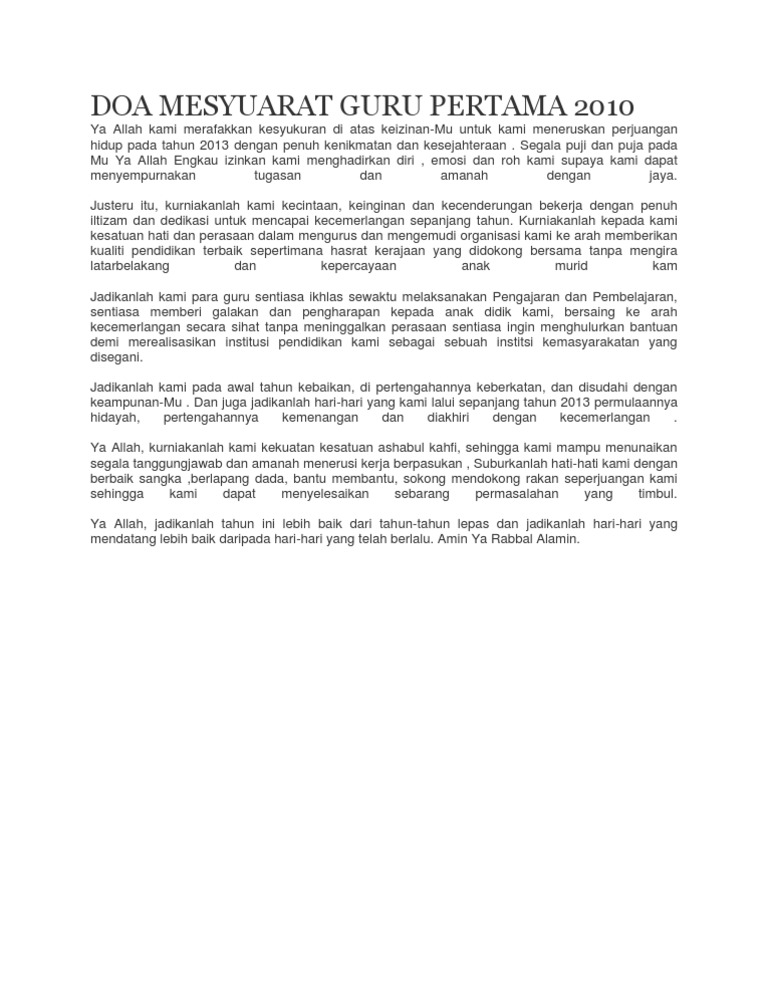 Apabila anda telah bersedia untuk menyertai mesyuarat, klik sertai sekarang. Doa sebelum dan sesudah belajar memiliki banyak manfaat serta fadilah untuk yang mengamalkannya. Bacaan doa pada awal majlis, merupakan suatu perkara yang wajib dilakukan sebagai contohnya, bacaan doa bersempena dengan mesyuarat di sekolah. Berilah atan alas dulang yang setimpal kerana dia telah bersusah payah mencari ubat penawar itu. Setiausaha juga perlu menyediakan minit mesyuarat.