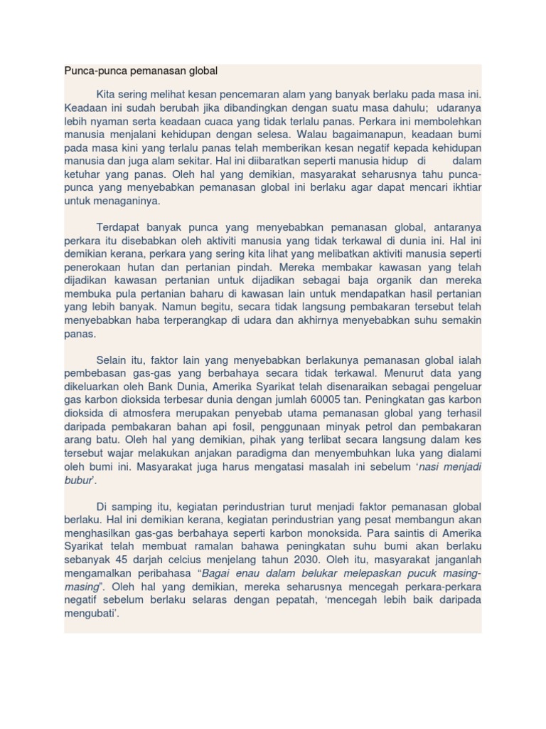 You can do the exercises online or download the worksheet as pdf. Pemanasan global atau pemanasan sejagat berkaitan dengan peningkatan suhu dunia. Pemanasan global ialah keadaan alam sekitar yang mengalami peningkatan suhu yang tinggi berbanding suhu normal. Suhu persekitaran menjadi semakin tinggi dan panas. Salah satu punca utama kepada fenomena pemanasan global adalah kesan rumah hijau.