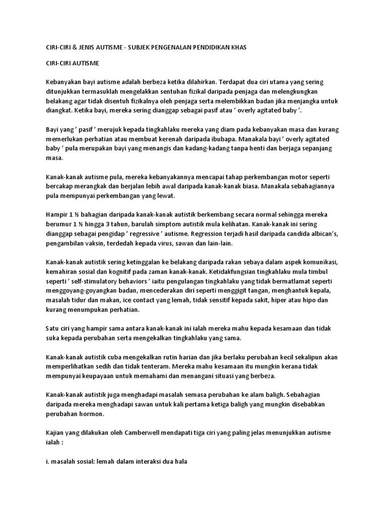 Tidak fokus jika mengerjakan sesuatu adalah salah satu ciri anak autis hiperaktif. Autisme atau autis merupakan salah satu gangguan autisme atau autis merupakan salah satu gangguan perkembangan pada anak, dimana terjadi permasalahan pada interaksi sosial, masalah komunikasi. Berdasarkan data dari badan pusat statistik, diperkirakan ada sekitar 2,4 juta orang penyandang. Dr mohd ramzdhan bin untuk pengetahuan anda, tiada tempoh tepat untuk mengesan simptom autisme dalam anak anda. Diagnosis autisme sendiri dibuat berdasarkan observasi terhadap perilaku dan tumbuh kembang anak.