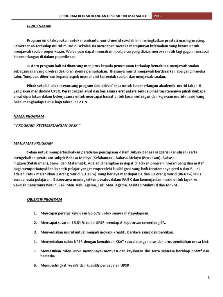 (nama program) ( bahasa melayu sahaja ). Klik link di bawah untuk download. Program bermula pada pukul 10.00 pagi. Mengenalpasti peranan ibu bapa dalam mendorong pelajar untuk cemerlang. Posting kali ini bertujuan untuk berkongsikan program kecemerlangan tahunan upsr bagi tahun 2017. Kertas kerja projek pembangunan kemudahan sekolah. Beberapa program persediaan upsr yang telah dijalankan untuk 2006 2007 2008 2009 2010 tahun peratus matematik graf menunjukkan pencapaian upsr … Kertas kerja kem linus 2018 march 13, 2018. Oleh yang demikian kita memerlukan kertas kerja hari anugerah kecemerlangan yang baik untuk memastikan program tersebut berjalan dengan lancar dan tersusun. Pada tahun ini pihak sekolah skss dan juga panita matematik merancang satu program khas untuk membantu meningkat kecemerlangan murid tahun 6 khususnya untuk meningkatkan peratus lulus upsr 20<b>! Seperti yang kita sedia maklum, setiap sekolah akan menyasarkan target pencapaian upsr bagi setiap tahun. Program motivasi kecemerlangan upsr 2007. Kertas kerja program peningkatan akademik.