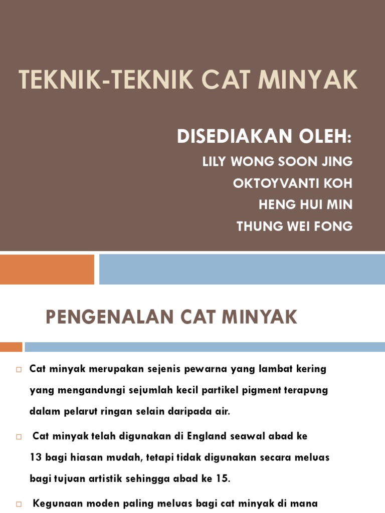 Dalam proses pengeringan, cat minyak ini relatif lebih lama dibandingkan dengan cat tembok biasa. Untuk menghasilkan cat minyak yang berkualitas tinggi, biasanya cat minyak akan terdiri dari 75 persen pigmen dan sisanya adalah bahan campuran. cat makna cat di kbbi adalah: Cat sendiri bisa dikatakan sebagai bahan pewarna yang sifatnya cair dan banyak digunakan untuk kebutuhan di rumah anda. Cat berisi bahan kandungan cat dan bahan pewarna berupa campuran zat kimia padat dengan cat pada umumnya berbahan dasar air atau minyak dan terdiri atas tiga komponen penting, yaitu arsen dan pewarna cat yang mengandung metal seperti titanium oksida, kromium dan besi saat ini jarang.