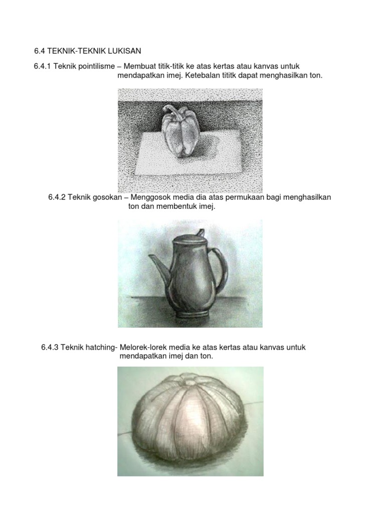 May 21, 2021 · teknik lukisan yang menggunakan kombinasi berbagai variasi ukuran dan warna titik dikenal dengan sebutan pointilisme. 20 eni lukisan adalah antara sebahagian hasil kebudayaan setiap bangsa di dunia. Feb 09, 2021 · seni rupa (fine art) adalah cabang seni yang membentuk karya seni dengan media yang bisa ditangkap mata dan dirasakan dengan rabaan. Garis secara definisi, garis adalah goresan atau batas limit dari suatu benda, ruang, bidang, warna , tekstur, dan lainnya. Apr 14, 2020 · dan penerokaan media dan teknik dalam penghasilan karya seni lukisan dengan menggunakan imaginasi dan idea secara kreatif.